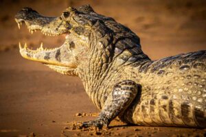 The bright red body of a Vermillion flycatcher sitting on the branch of a leafless tree catches our eye, while around us dozens of caimans (South America’s version of a crocodile) rest in the water. One of them lies with its head up, a fish in its mouth.