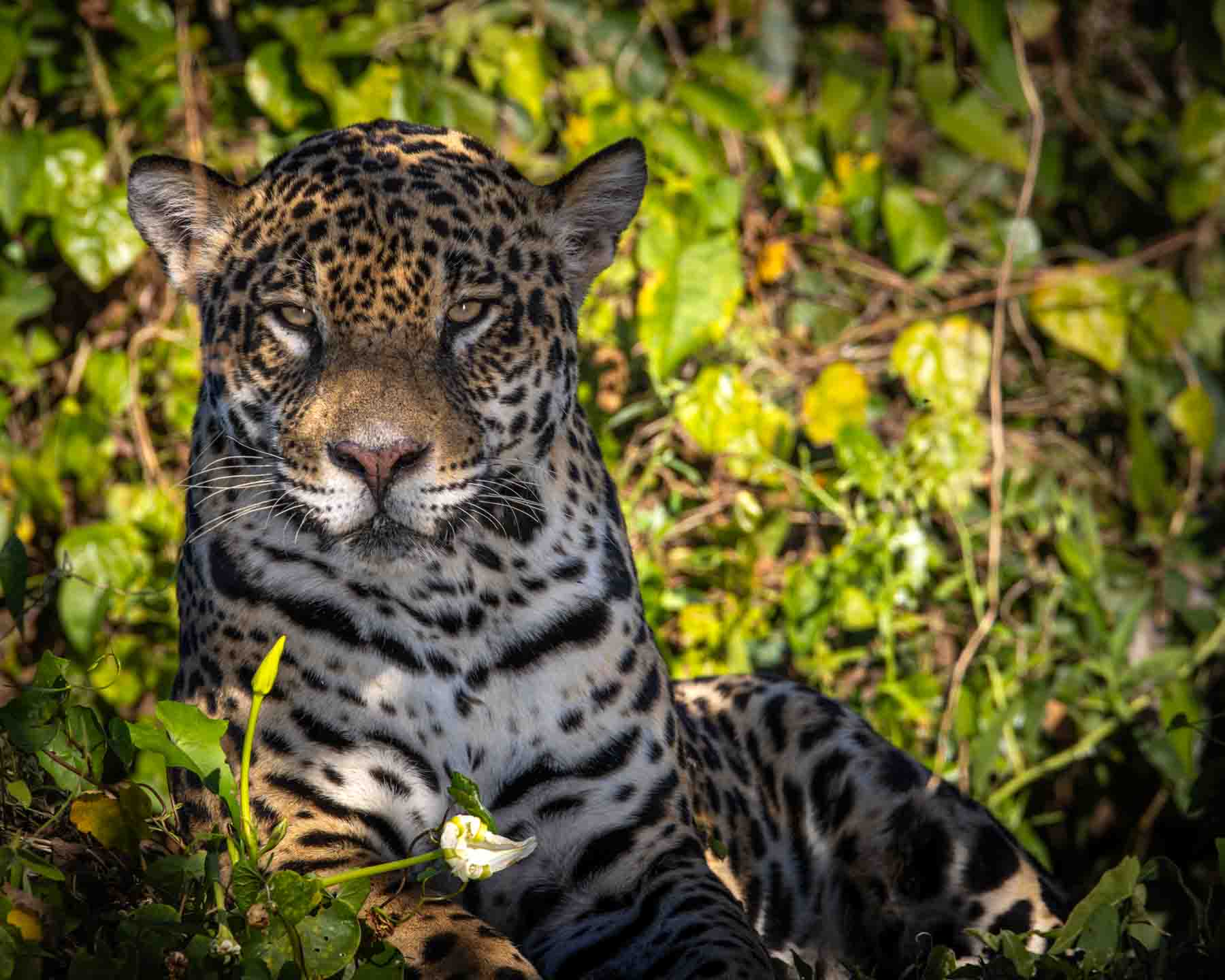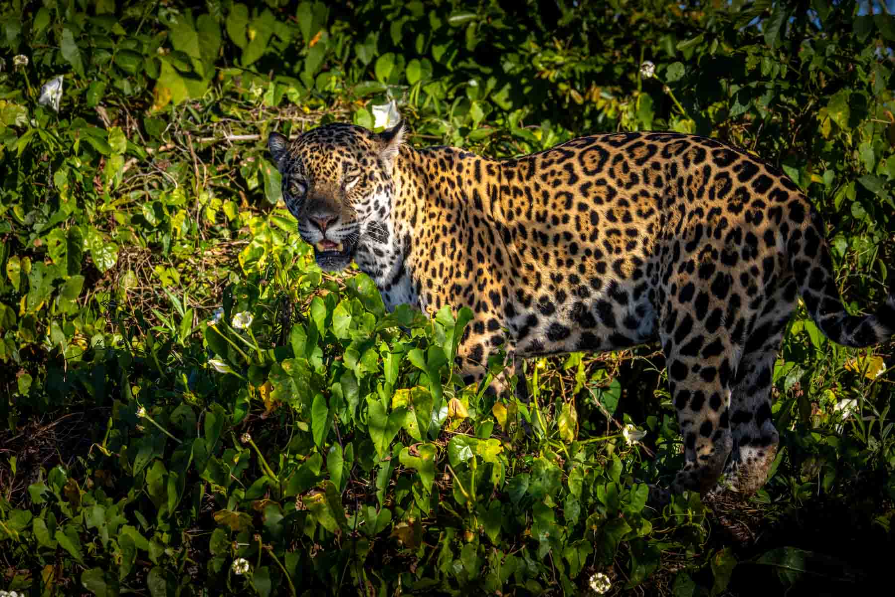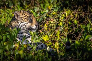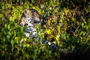 We are looking for a mum and her two cubs, but find a solitary Jaguar hidden by shrubbery instead.