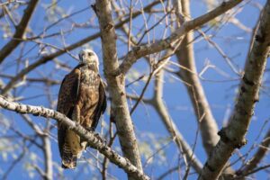 We stop to photograph a capybara eating on the side of the river and a black collared hawk who lands on a branch close to our boat in a tree that already houses a kingfisher and an egret.