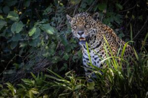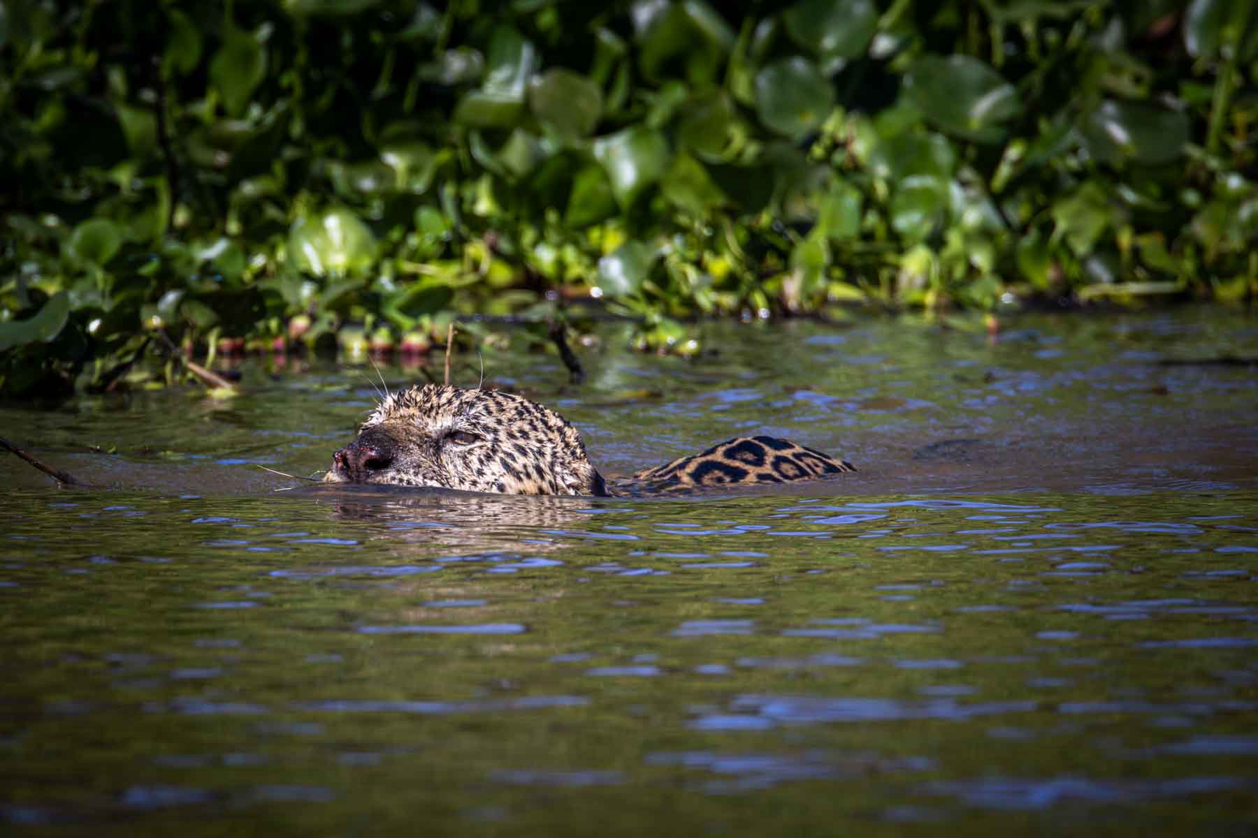 We’ve just finished photographing a giant caiman when we see another boat. They’ve seen a Jaguar around the corner.