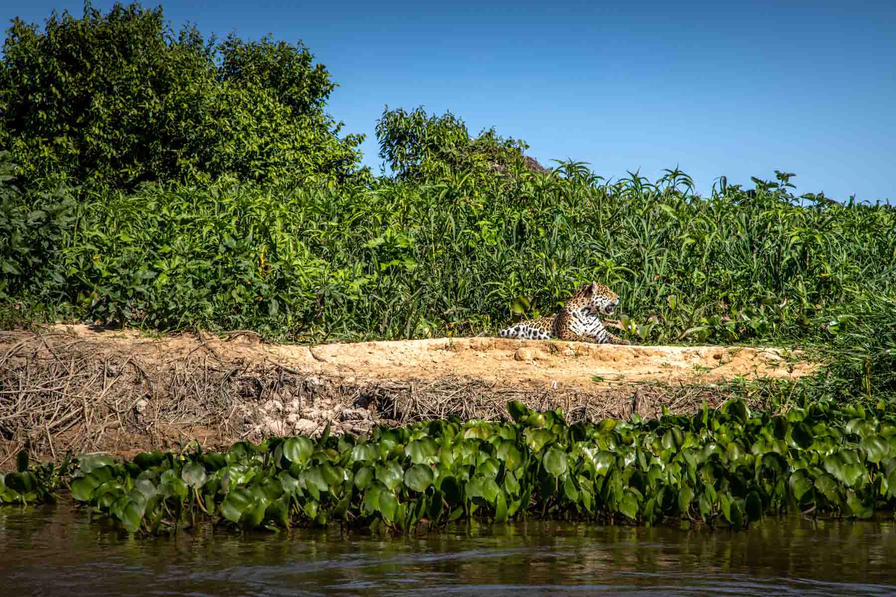 We stop for a photograph or two, but the jaguar is relaxing on the bank, barely moving.