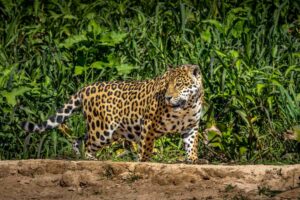 Midmorning we see a Jaguar swimming along the edge of the river. We watch as she gets out of the water and walks along the riverbank.